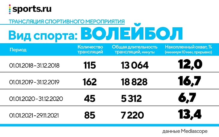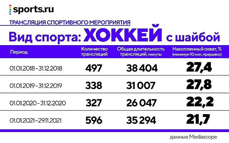 2. Баскетбол в целом уже уступает по накопленному 10 минутному охвату даже волейболу (в 2018 – 152 трансляции и 11,9% в баскетболе против 115 и 12,0% в волейболе, а в 2021 – 188 трансляции и 9,3% в баскетболе и 85 и 13,4% в волейболе). Отрыв от хоккея измеряется двукратными цифрами.