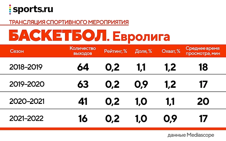 Согласно данным Mediascope, сколько-нибудь ощутимого разрыва между трансляциями Лиги ВТБ и Евролиги на «Матч ТВ» не наблюдается. Доля аудитории Евролиги составляет 1,0% в 2020-22 годах против 0,8-0,9% у Единой лиги ВТБ, рейтинги идентичны, а охват у Лиги ВТБ даже выше (1,2-1,4% против 0,9-1,2%). Положительной динамики трансляций Евролиги на «Матч ТВ» опять же нет.