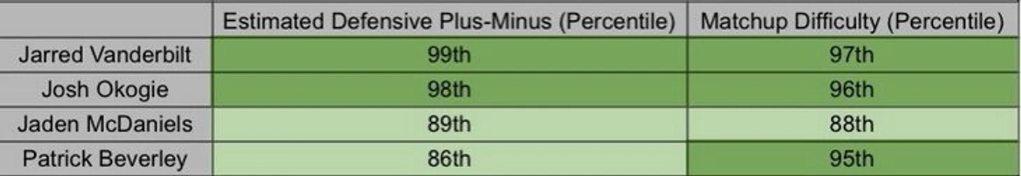 Последнее, «Миннесота» на 9-м месте в лиге по количеству пропускаемых очков на 100 владений, что обеспечивается наличием четырех топовых защитников в составе.