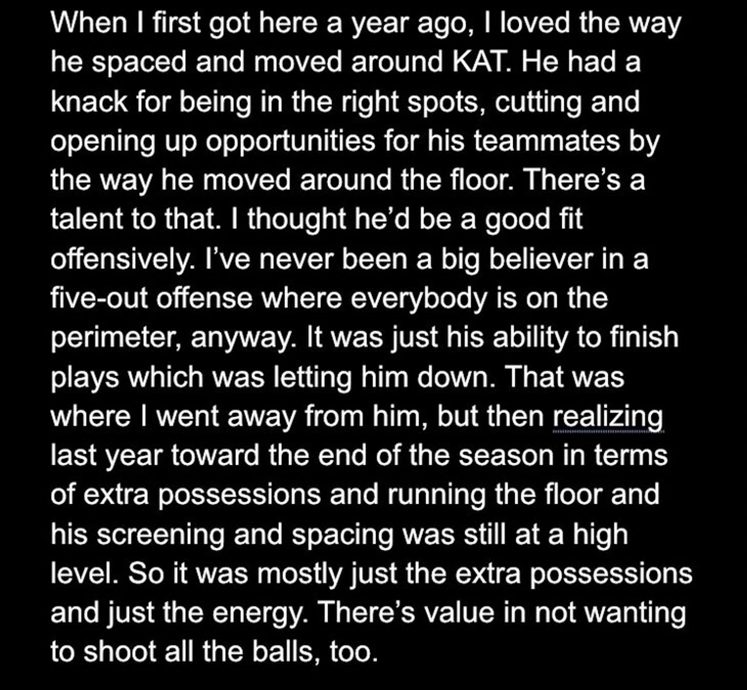 Во-вторых, несмотря на то, что состав команды почти не изменился с прошлого сезона, Миннесота сильно изменилась в тактическом плане. К примеру, в нападении мы больше не играем «five-out» в его самом ортодоксальном исполнении, с пятью бросающимися игроками на периметре. Поэтому говоря о небросающем Вандербилте тренер Финч сказал, что основная проблема Вандербилта в том, что он плохо завершал из-под кольца. То есть важно завершать конкретное владение в атаке результативным действием, а не просто наличие пяти бросающих игроков на площадке.