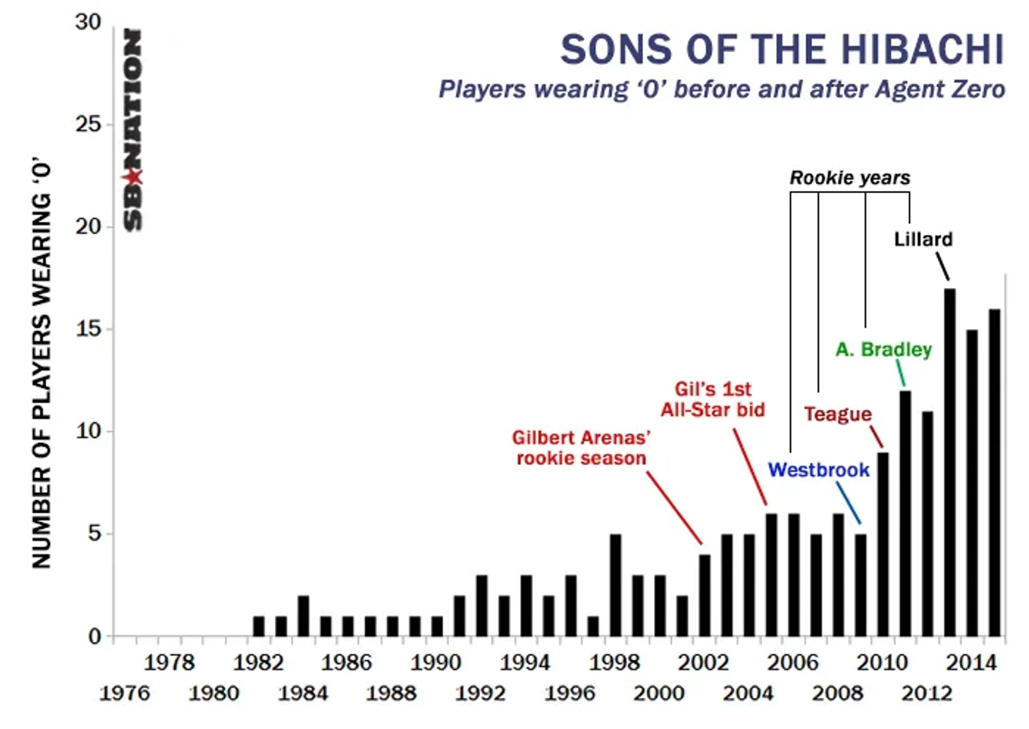 Когда Аренас восхитил всю лигу в первые сезоны и был в 2003-м украден из «Голден Стэйт» «Вашингтоном» (что привело к Поправке Гилберта Аренаса в правилах контрактов НБА), он забрал №0 в столицу США, но в «Уизардс» уже играл человек под №00 – Брендан Хэйвуд. Хэйвуду пришлось сменить номер – сейчас такой проблемы не было бы.