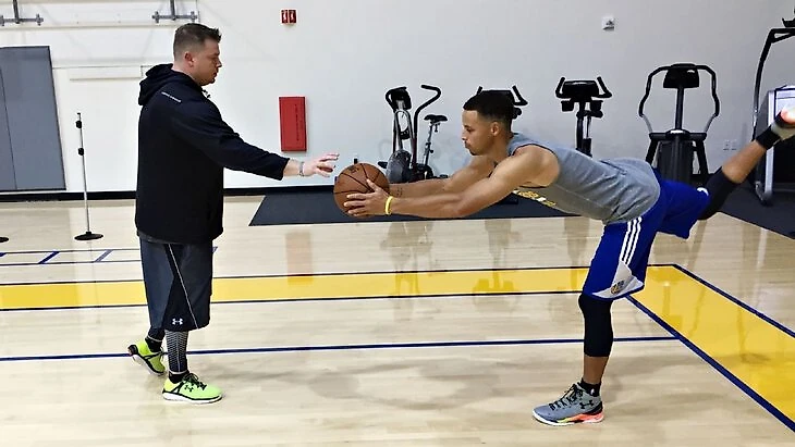 Пэйн моделировал для него гиперсложные условия. Во многих упражнениях Карри нужно выполнять упражнения и при этом вести мяч другой рукой. Или попадать из-под кольца и со средней дистанции. Ловить теннисные мячи. Выполнять игровые действия с сопротивлением висящего на нем каната.