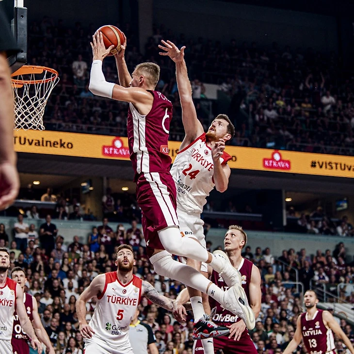 В первом матче третьего этапа латвийские баскетболисты принимали соперников из Турции. Матч состоялся в "Арене-Рига" и собрал свыше 11 тысяч зрителей. Хозяева площадки разгромили Турцию со счетом 111:85 (31:20, 25:27, 31:16, 24:22). Самым результативным у сборной Латвии стал Кристапс Порзиньгис с 22 очками, который впервые сыграл за национальную команду с 2017 года.
