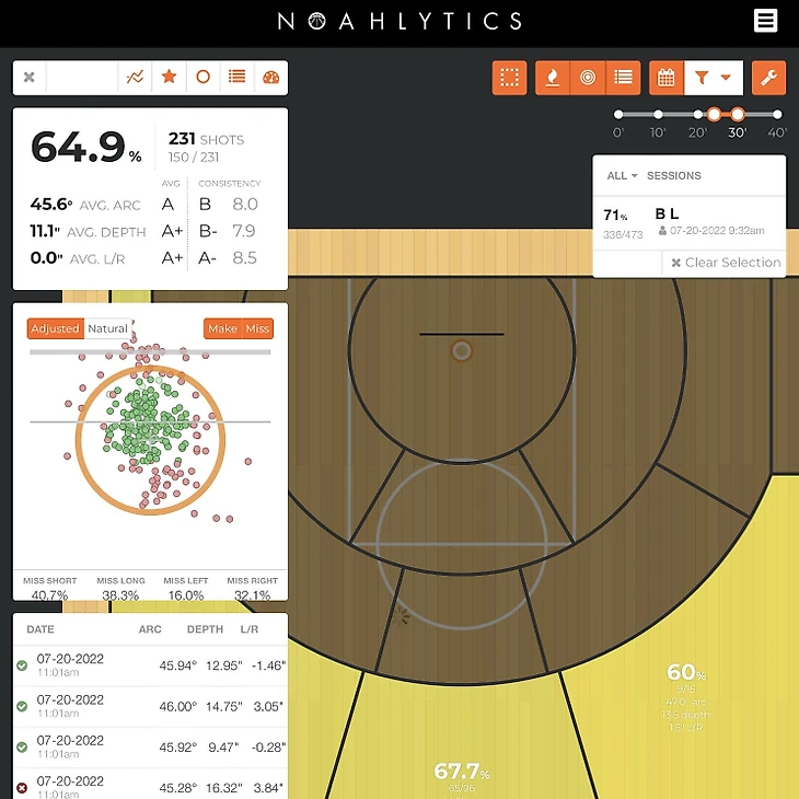По сути, это камера, тщательно фиксирующая все стадии броска. Она определяет угол, под которым мяч попадает в кольцо, траекторию полета мяча, расстояние броска и координирует градус отклонения полета мяча влево и вправо. С помощью камеры, расположенной на высоте двух метров над щитом, Noah может считывать все, что происходит на площадке в режиме реального времени.