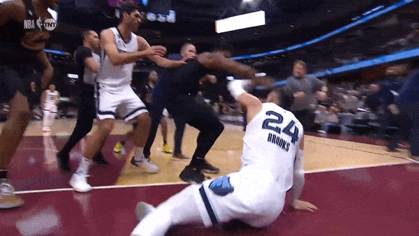 Митчелл запустил в соперника мячом и начал стычку, успев один раз толкнуть в грудь и завалить Брукса на паркет.