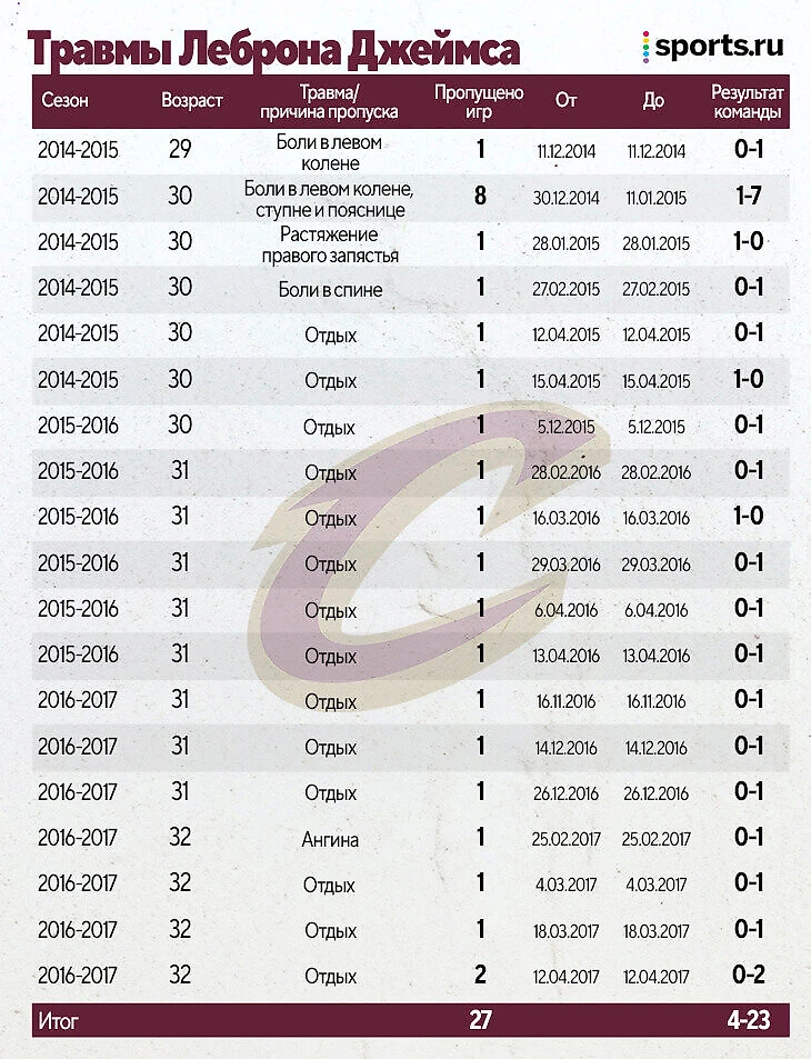 Может кто-то забыл, но в том же сезоне 16-17 Кливленд специально сливал матчи, чтобы не попасть в плей-офф на Визардс, ну и многие пропуски Леброна были вызваны как раз плановым сливом...