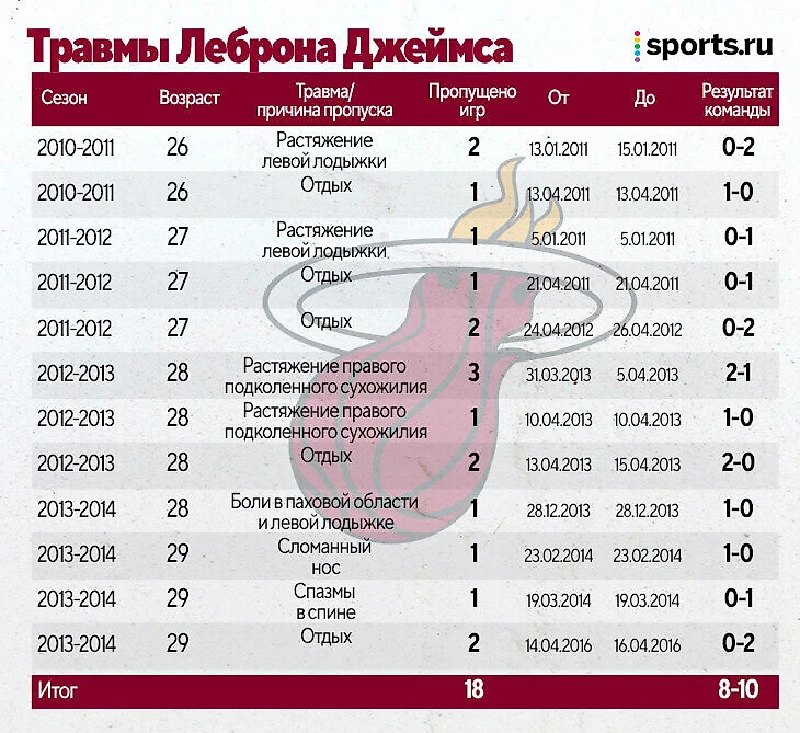 В период первичного бытования Джеймса в «Кливленде» он пропустил лишь 26 из 574 матчей, а его самое продолжительное отсутствие пришлось на сезон-2007/2008 из-за – подумать только – растяжения связок левого указательного пальца.