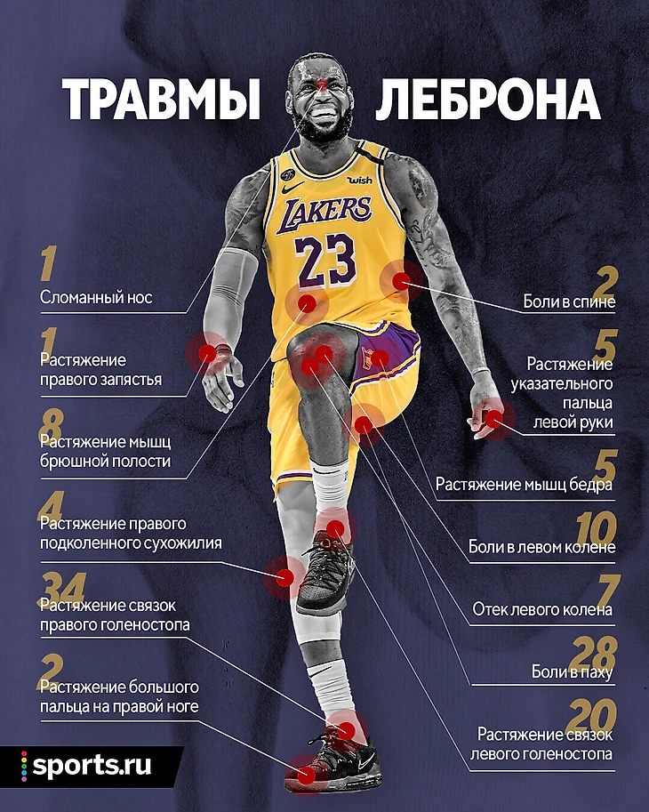 В то же время не стоит все списывать исключительно на возраст. Если напрячь память, то можно припомнить, что травма голеностопа, стоившая Джеймсу пропуска 26 матчей в сезоне-2020/2021, зависела вовсе не от самого Леброна.