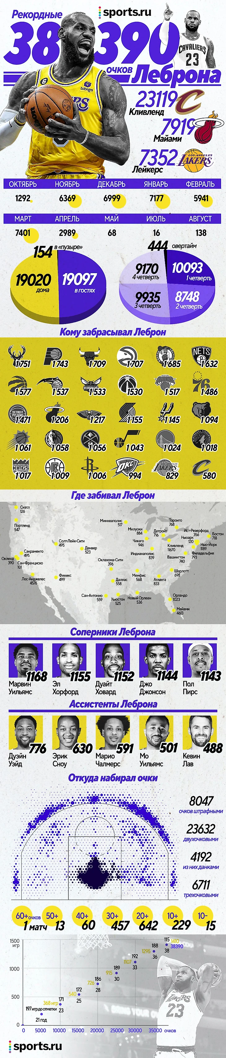 Рекорд Карима держался почти 40 лет, а 38 390 – рекорд временный, Леброн уже в следующей игре повысит планку, но в исторический момент мы разобрали все его очки – по клубам, соперникам, даже городам.