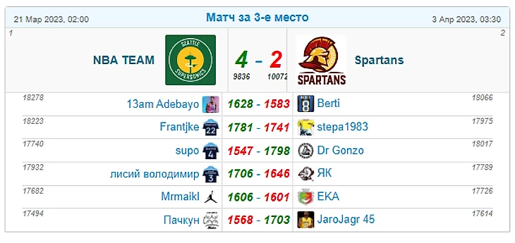Третье место заняли NBA TEAM, тем самым улучшив свой прошлогодний результат, где они не смогли в матче за 3 место победить Каспий. Команда провела очень мощный сезон, заработав в регулярке 1 место по набран командным ФО, а в матче за 3 место они победили Spartans занявших 7 место в регулярке.