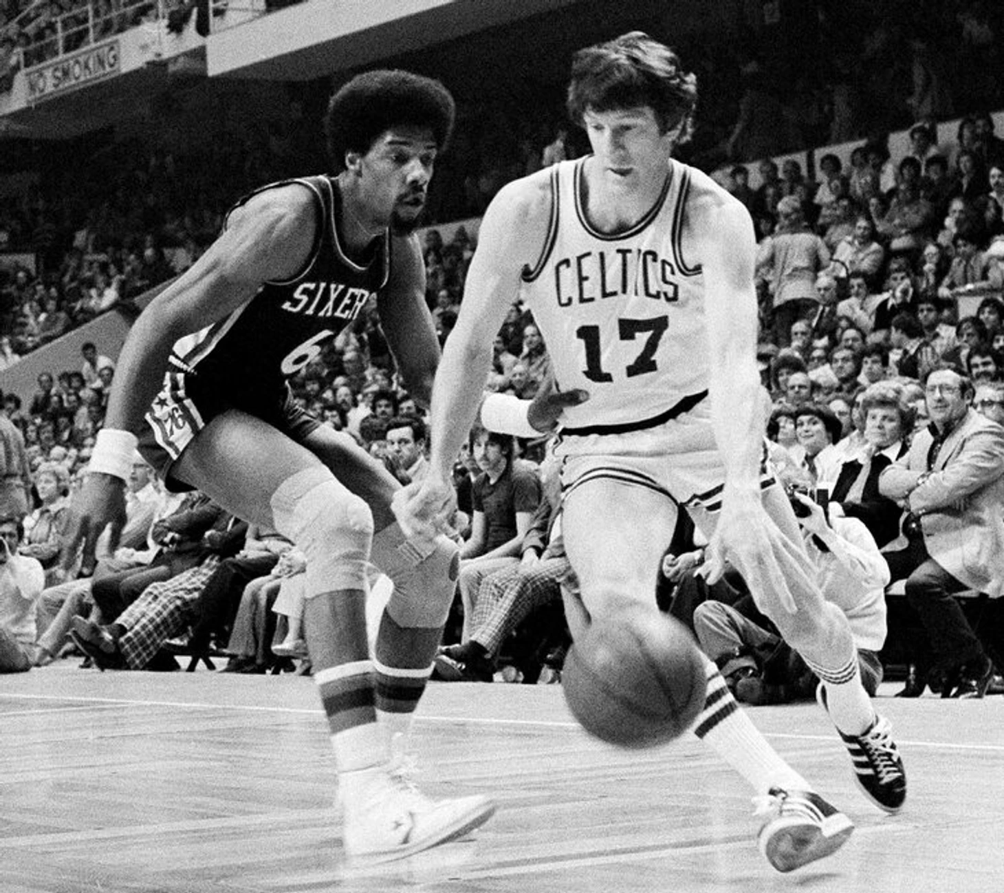 «Сиксерс» провели первую половину 1970-х на дне (в том числе чудовищный сезон-72/73 с 73 поражениями), но удача улыбнулась при объединении НБА и АБА в символичном 76-м: «Нетс» были вынуждены продать Джулиуса Ирвинга, и лучший игрок лиги достался именно «Сиксерс». «76-е» мгновенно стали претендентом на титул – которым владели как раз «Селтикс», чемпионы 1976-го.
