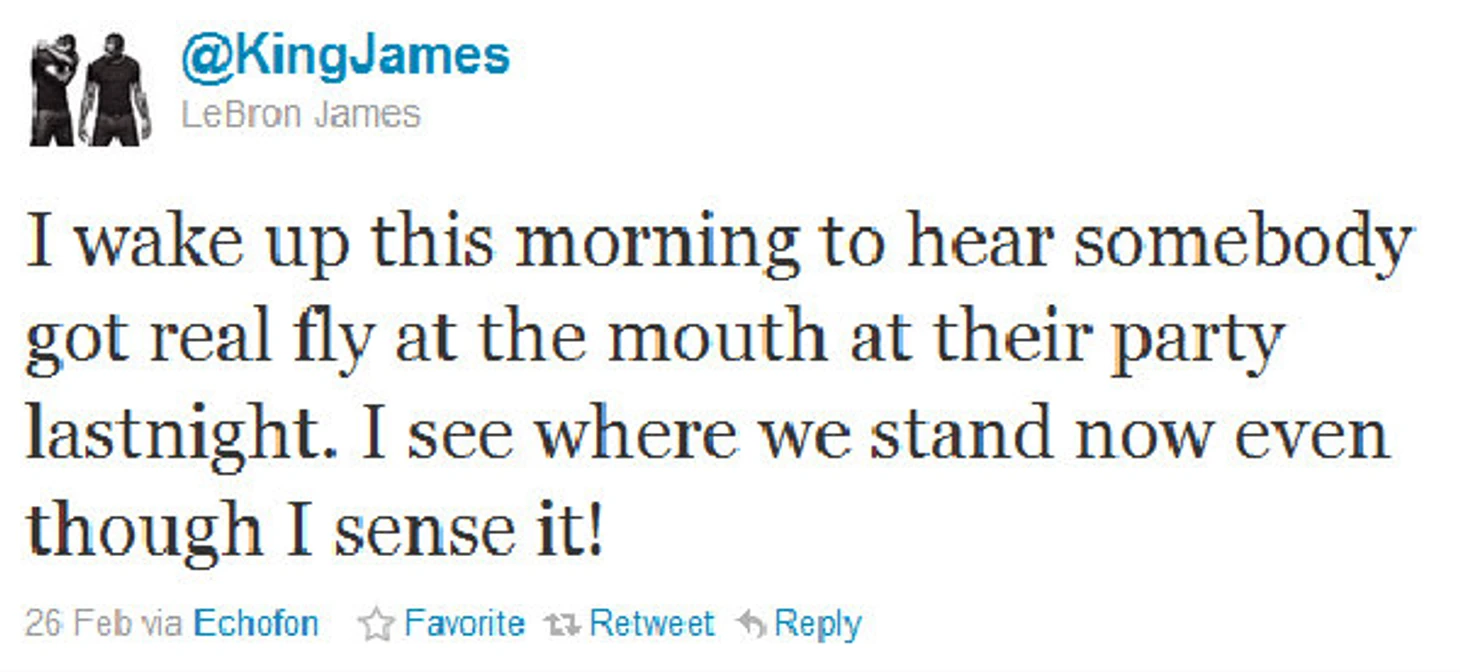 В субботу днем Джеймс написал: «Просыпаюсь я сегодня утром и слышу, что кому-то вчера на вечеринке в рот залетела настоящая муха. Я-то вижу, где мы находимся». А потом – «Вырази свои чувства».