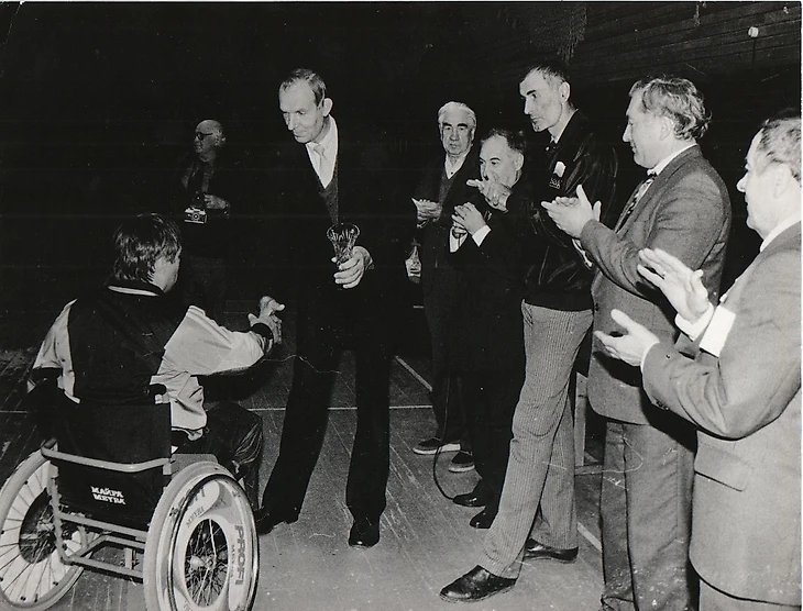 Здесь я вручаю награду баскетболисту-колясочнику. Фото сделано довольно давно – Вольнова (в черной куртке, справа) уже нет в живых. Вообще, считаю его лучшим баскетболистом всех времен. 12-кратный чемпион Советского союза, золотой призер Олимпийских игр и чемпионата Европы. А еще он был моим хорошим другом.