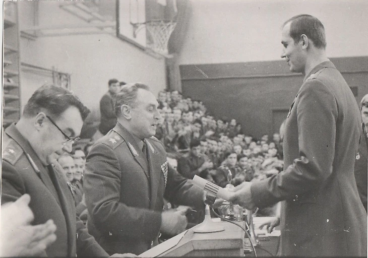Здесь уже меня чествуют. Маршал Харченко вручает какой-то знак отличия – за отличную работу или соревнования, уже не помню. Харченко потом разбился на вертолете. Хороший мужик был, душевный.