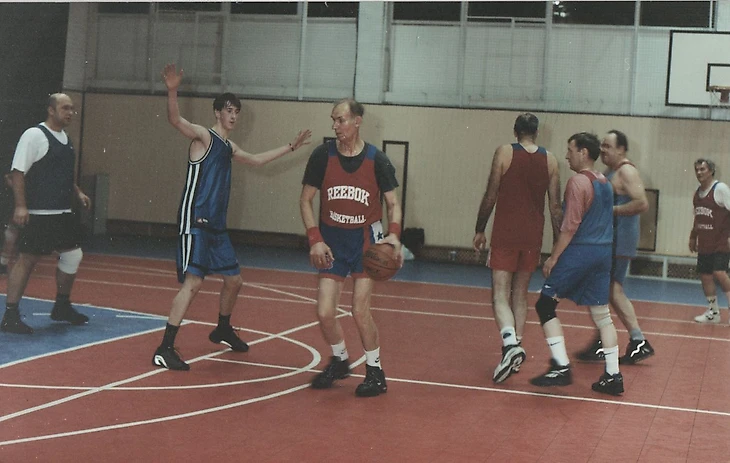Начал играть за ветеранов – получил, наконец, нормальные кроссовки, удобную форму. Вот в этом зале мы собирались несколько раз в неделю, но потом площадку у нас отобрали. Там сейчас в теннис играют. А компания хорошая подобралась.