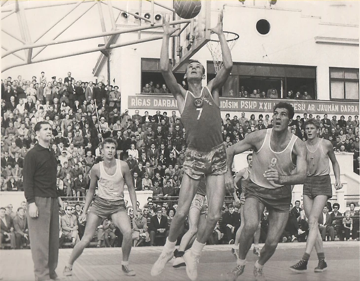 Очень символичный момент. Кроме Круминьша, у «Риги» еще были здоровенные центровые Валбанис и Мужникс. Да и форвард Липса был моего роста (202 см – прим. автора). Непросто нам приходилось. Я вот оказался на паркете – это мы бросили Валбаниса и вдвоем пытались помешать пройти Круминьшу. Насилу справились. Кстати, посмотрите на трибуны – яблоку негде упасть. Это – на малой спортивной арене Лужников. Играли на открытом воздухе, площадки были с деревянным настилом.
