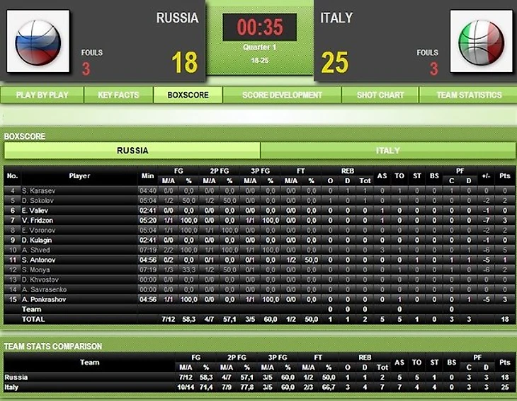 1-я минута: Начинают и те, и другие нервно, но первыми открывают счет итальянцы: Датоме убегает – 2:0. Воронов отвечает из-под кольца – по 2.