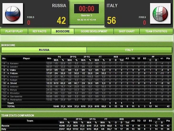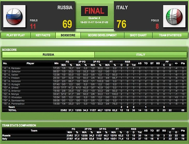 10-я минута – У Италии два сложных броска попробовал Белинелли, у России – Швед. Оба промахнулись – Моня красиво заблокировал Марко. 42:29 после первой половины – и те, и другие играют без защиты, много бегают, много бросают, но перевес у Италии: за счет подбора, большего количество быстрых атак и более продуктивной игры в «краске», где они забили практически все (9 из 12).