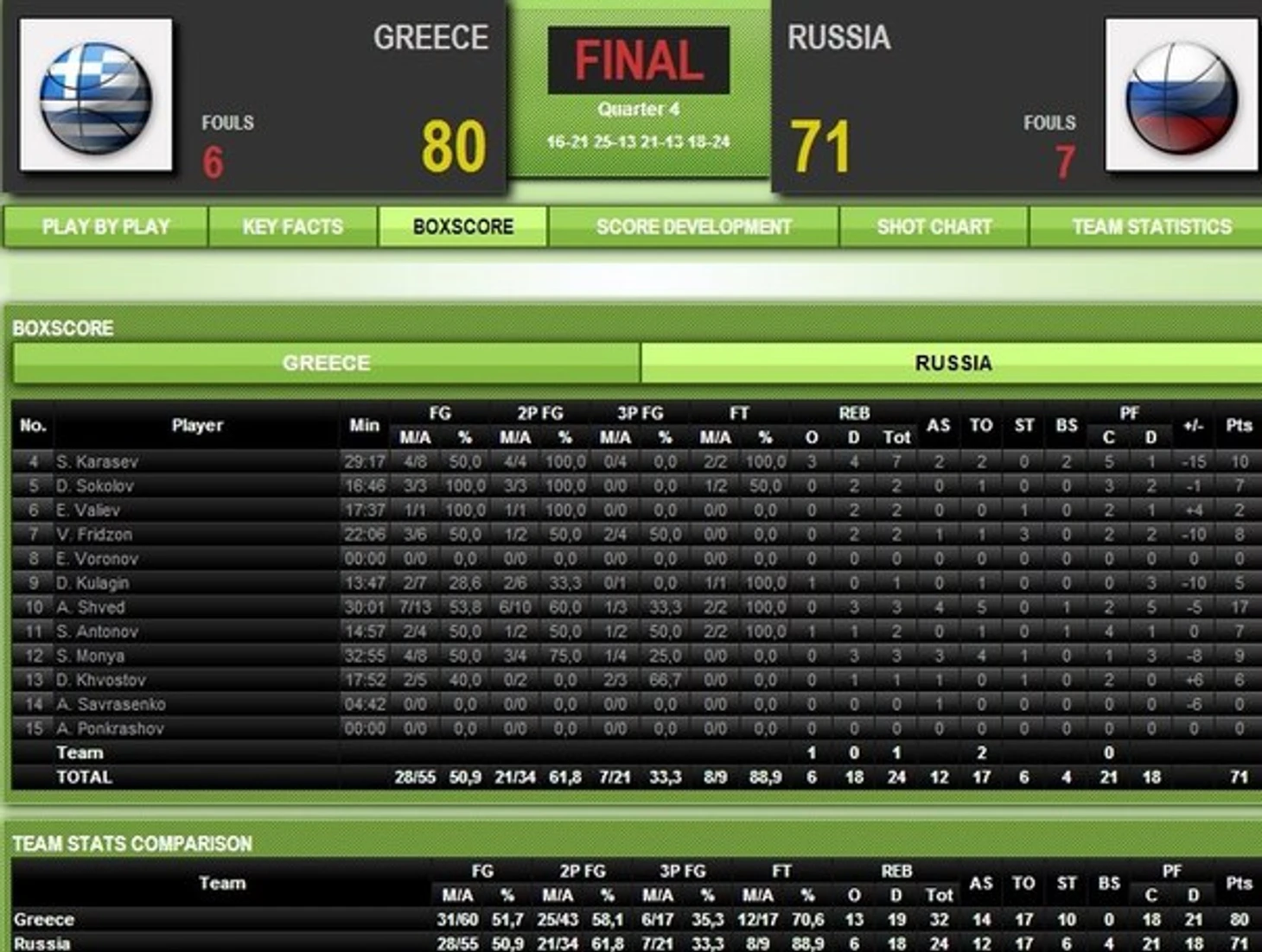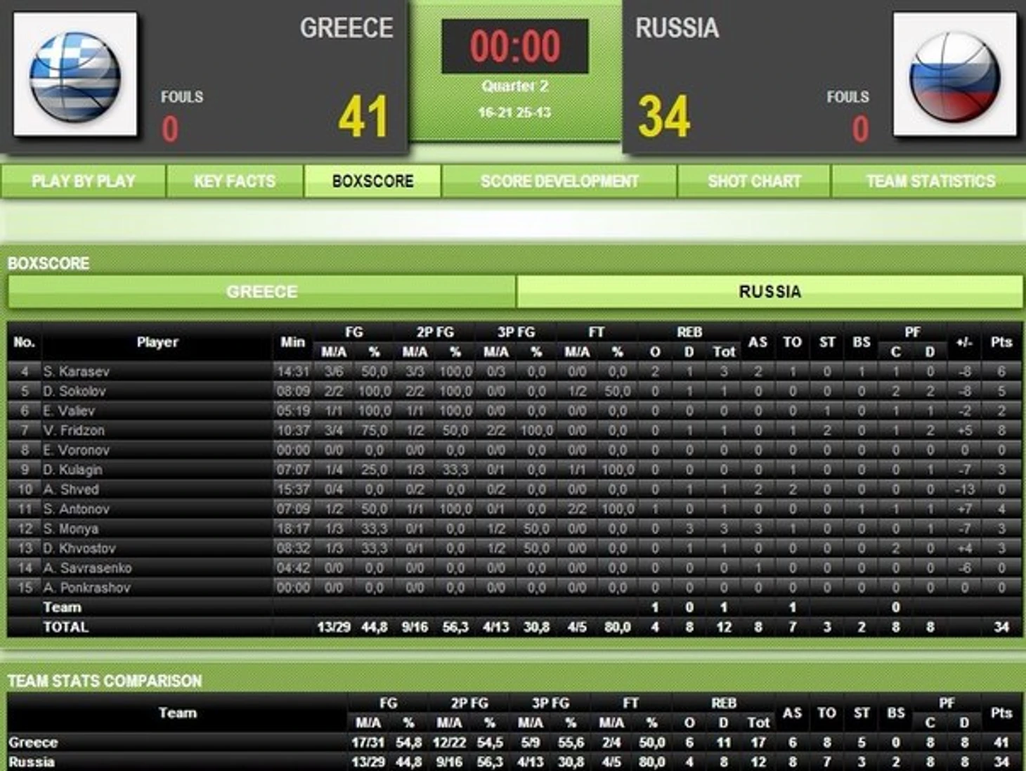 6-я минута – Антонов меняет Саврасенко. Карасев добавляет после промаха Мони в одном прыжке – 4:8. Замены в обеих командах: Зисис – Маврокефалидиис – Спанулис – Принтезис – Каймакоглу. Карасев продолжает попадать – со среней – 6:8. Хвостов – Фридзон – Карасев – Валиев – Антонов. Фридзон врывается в «краску» – по 8.