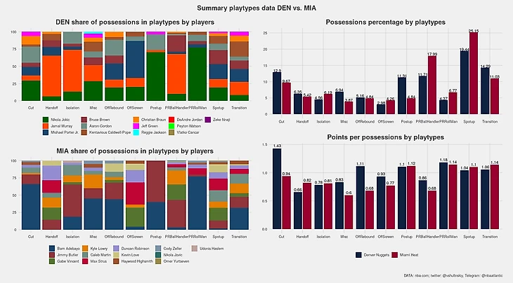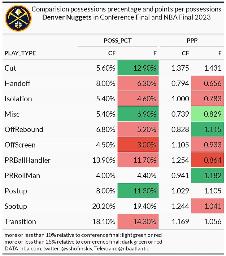 Майами заметно больше Денвера играло спот-апы и PNR BH. У Наггетс подобный перевес только в пост-апах. Качество катов Денвера сильно выбивается из ряда эффективностей этой серии. Также Наггетс были заметно лучше в пик-н-ролле, но тут скорее стоит говорить о том, насколько в этой компоненте были плохи Хит. Причем в компоненте с долей 18 процентов.