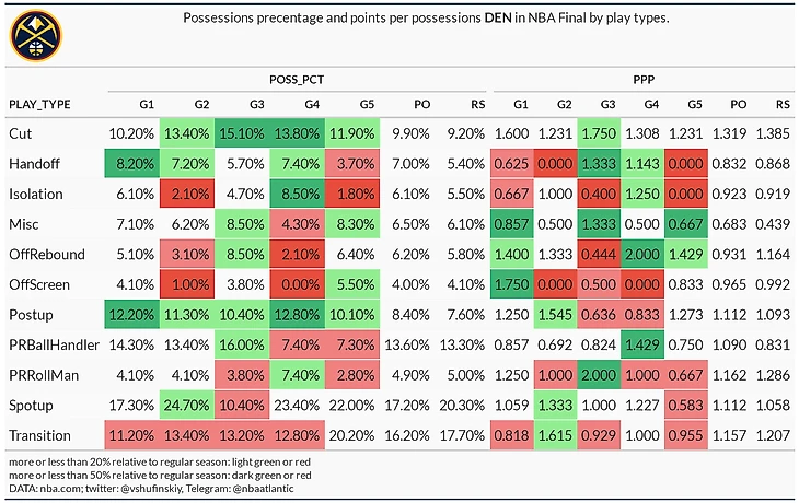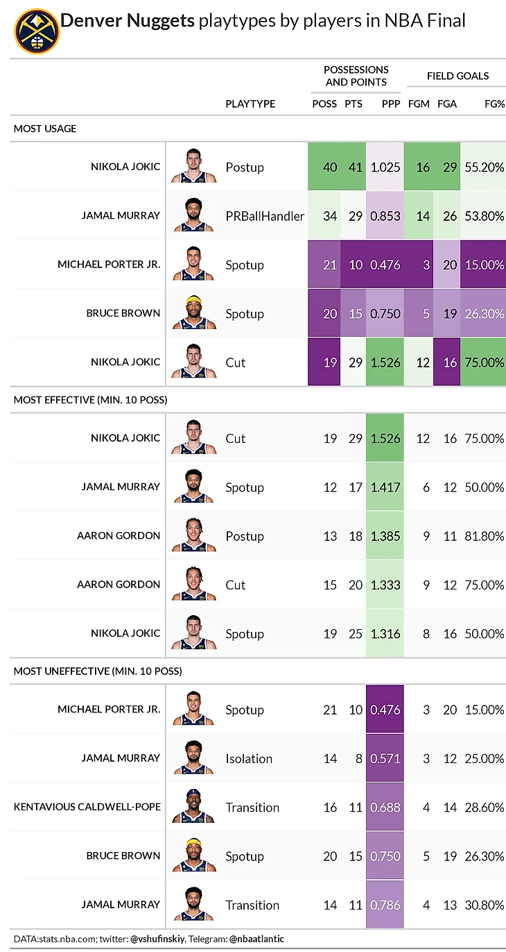 Распределение типов владений у Денвера во время финала было нетипичным: команда играла много катов и пост-апов, при этом быстрые атаки только в последней игре серии составили больше 15% от всех владений. В третьей игре серии Наггетс резко уменьшили число спот-апов (в два раза меньше, чем в других играх серии), а в 4 и 5 также в два раза рухнуло использование PNR BH. Но у этого падения есть логическое объяснение: эффективность PNR BH в первых трех играх не превышала 0.9 PPP. Вообще третья игра серии в исполнении Денвера была очень необычной. В ней не было ни одного типа владения, который составил бы хотя бы одну пятую от всех розыгрышей. Максимум в третьей игре – это 16% PNR BH. При этом 7 типов имеют использование 8+ процентов. Каты, несмотря на сильно возросшее использование, были очень хороши и по эффективности, лишь раз упав ниже 1.3 PPP. А вот с быстрыми атаками и пик-н-роллами у команды из Колорадо все было так себе. У каждого типа есть только по одной игре, в которой он работал хорошо. В остальных они были либо ниже среднего, либо просто ужасны.