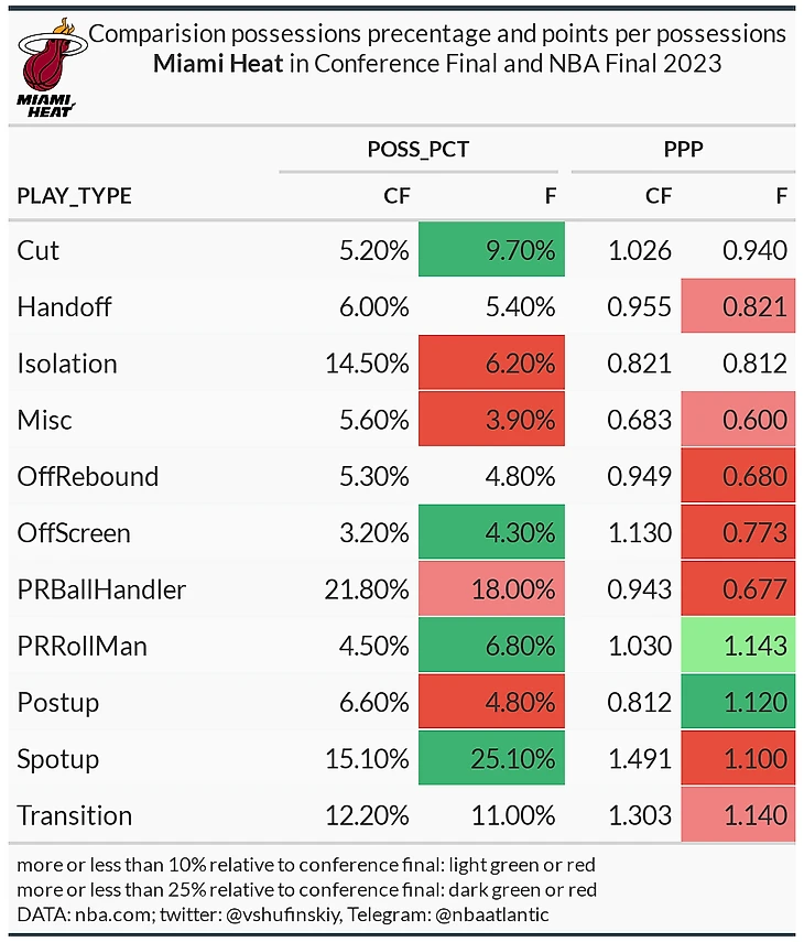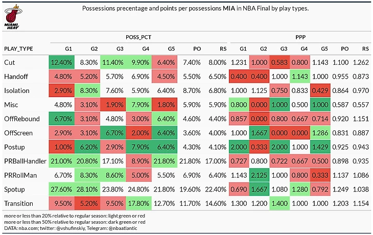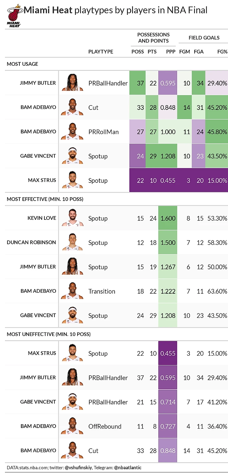 По катам у Майами ситуация схожая с Денвером: взрывной рост почти в два раза, вызванный очень малым их использованием в финале конференции. Тут правда сходства заканчиваются: если врывания Наггетс были опасны в обоих раундах, то у Хит они также в обоих раундах выглядят плохо. 0.9 PPP для такого типа – это ужасно. Но у катов в доле Майами не самый большой рост. Вдохновившись показателями серии против Бостона, Майами на десять процентов увеличили долю спот-апов. Посмотрев на падение в 0.4 PPP можно сказать, что зря, но это не совсем так. 1.1 PPP для спот-ап – это хорошая эффективность, в регулярке только 3 команды имеют показатель лучше. Просто цифры в серии с Бостоном были космические и случился закономерный регресс к среднему. Хотя не провались Струс все могло сложиться иначе, как мы увидим ниже у других игроков Хит спот-апы шли. Но в целом падение эффективности относительно финала конференции очевидно: семь типов в красной зоне, а в плюсе только два с общим объемом в двенадцать процентов.