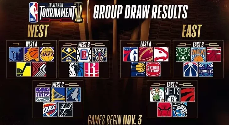 30 клубов лиги поделены на 6 подгрупп - по 3 для каждой конференции, в подгруппах 5 соперников. НБА таким образом хочет сохранить формат финала «запад против востока». На самой заре они не хотят сразу уходить от рабочих уже формул, но возможно когда турнир перестанет вызывать вопросы и станет популярным, организаторы разрешат себе уйти от жесткого разделения по конфам (что позволит выводить в финал сильнейшие клубы особенно в те сезоны, когда восток или запад будут намного мощнее своих соседей).