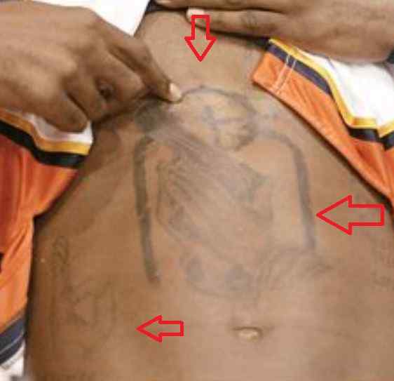 Нанес Авраама Линкольна себе на шею (в благодарность за освобождение рабов) и змею с игровым номером на спину.