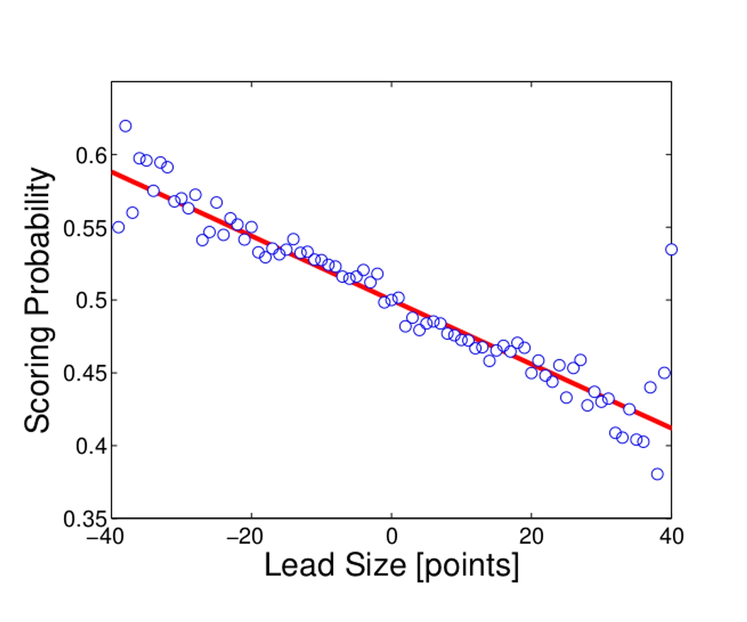 довольно мал по своему влиянию – скорость набора очков падает всего лишь на 0.0022 на каждое очко положительной разницы в счете