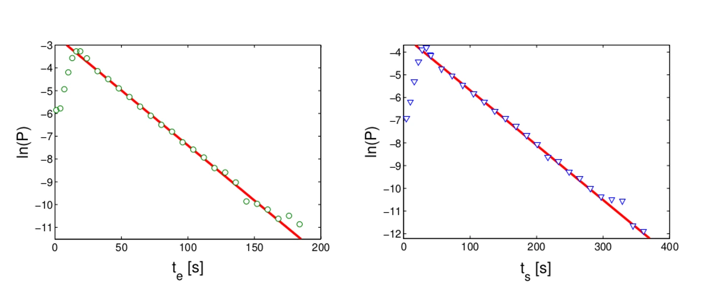 t_e – сколько времени прошло до следующего эпизода набора очков любой из команд, t_s – сколько времени прошло до следующего эпизода набора очков той же самой команды. Пик вероятности для t_e приходится на 16 секунд. Потому что после пропущенного мяча у команды есть 24 секунды на то, чтобы забить самой. Распределение t_s повторяет растянутое по времени в 2 раза распределение для t_e, с пиком на 32ой секунде.