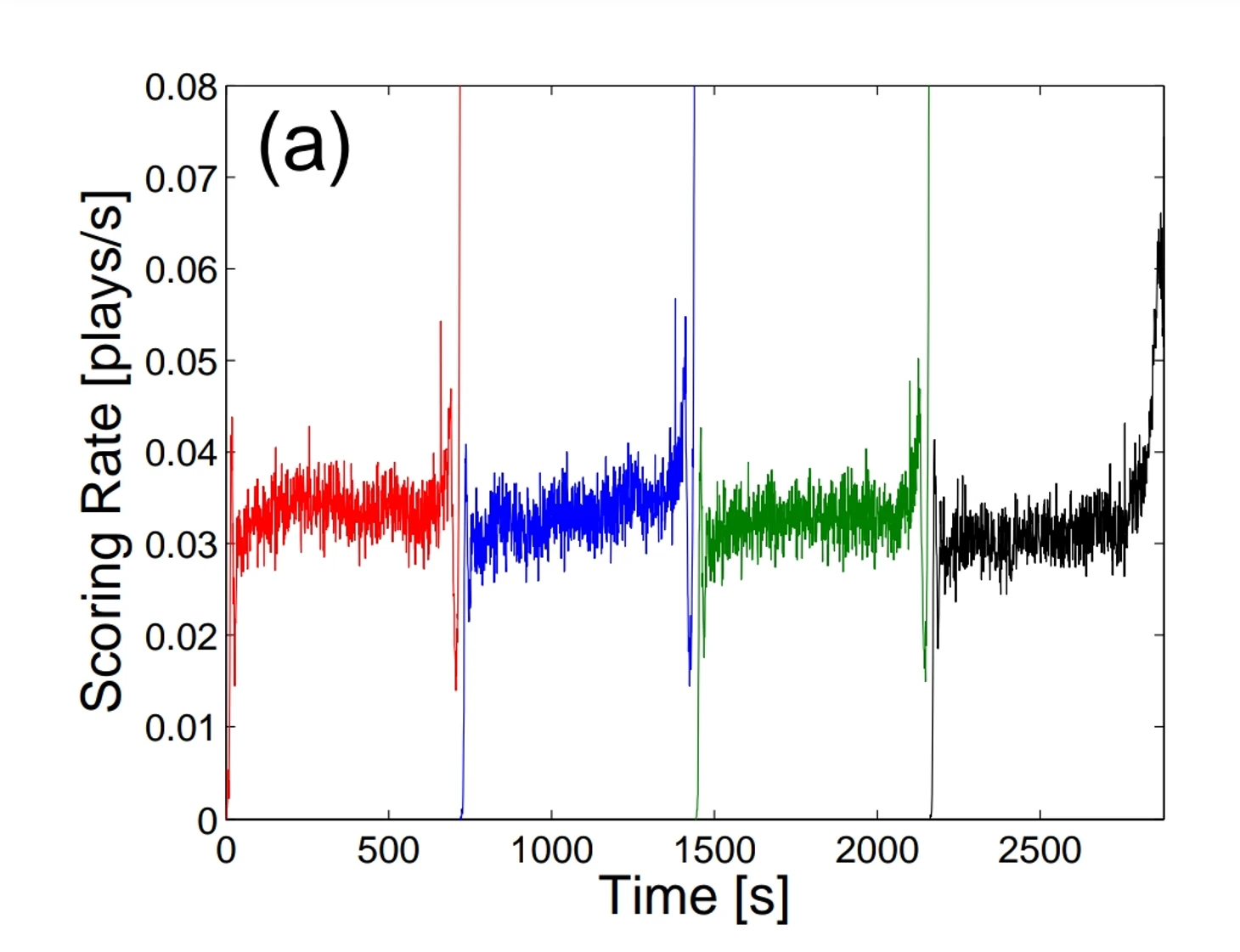 Еще больший скачок в конце 4ой четверти – результат ускорения игры проигрывающей командой и тактических фолов.