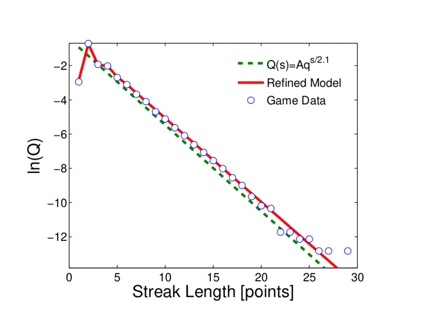 Если учесть, что за эпизод набора очков команда может заработать 1, 2, 3 или 4 очка с разной вероятностью, то получится чуть более сложная модель, которая лучше соотносится с тем, как часто серии разной длины происходили на самом деле:
