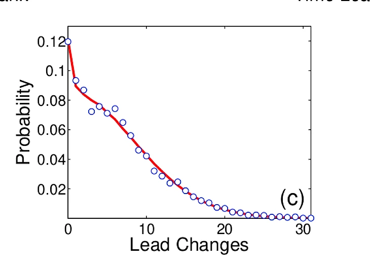 Антиперсистентность – сразу после забитого мяча вероятность, что следующей забъет та же самая команда, равна 34.8%, а вероятность, что это сделает только что пропустивший соперник, – 65.2%. Это прямой результат перехода владения после забитого мяча. Из этого и среднего количества очков для одного эпизода набора (примерно 2.09) можно составить модель экспоненциального затухания для вероятности количества очков, которые одна команда набирает подряд.