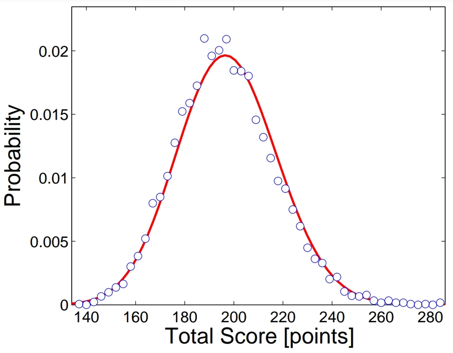 Тогда можно рассчитать теоретическое распределение суммы очков обеих команд на исходе 4ой четверти по формуле и сравнить с тем, что было в реальных играх: