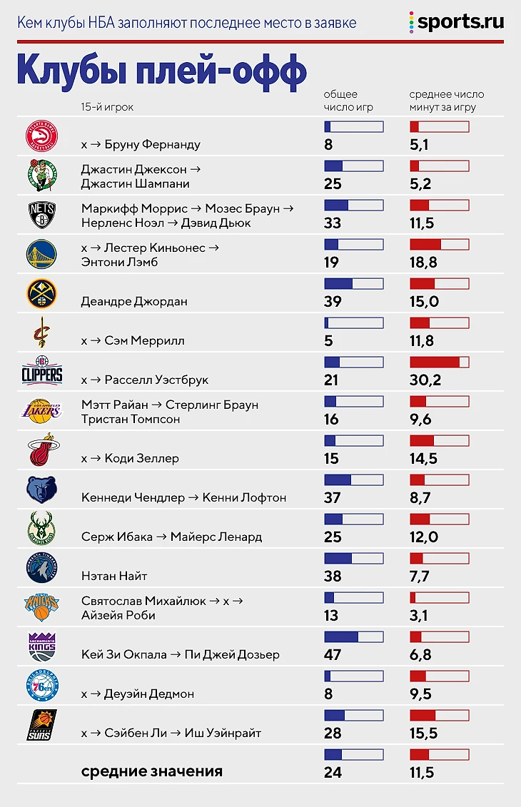 • часто игроков с дальнего конца скамейки отчисляют или обменивают, и 15-е место становится каруселью коротких контрактов, как в «Бруклине»;