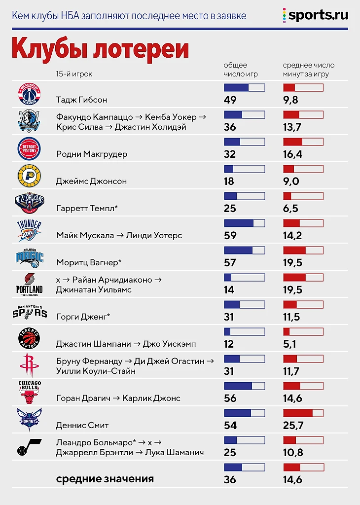 Вот что получается: последние игроки даже в слабых командах все равно выходят на паркет меньше, чем в половине матчей, и играют все так же мало: меньше 15 минут за игру. И эту статистику тянут вверх особенные случаи: