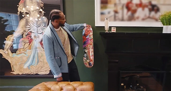 С кроссовками и со скейтбордом тоже дополнительно поработал Кьянде Уайли.