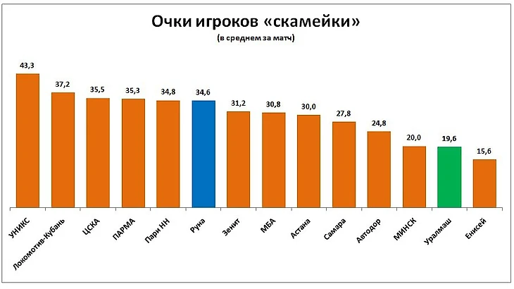 В целом же у «Уралмаша» пока нет такой глубины состава, как у «Руны». Это подтверждают и цифры. По количеству очков, которые приносят игроки скамейки, москвичи располагаются близко к лидерам, а вот уральцы находятся в самом низу.