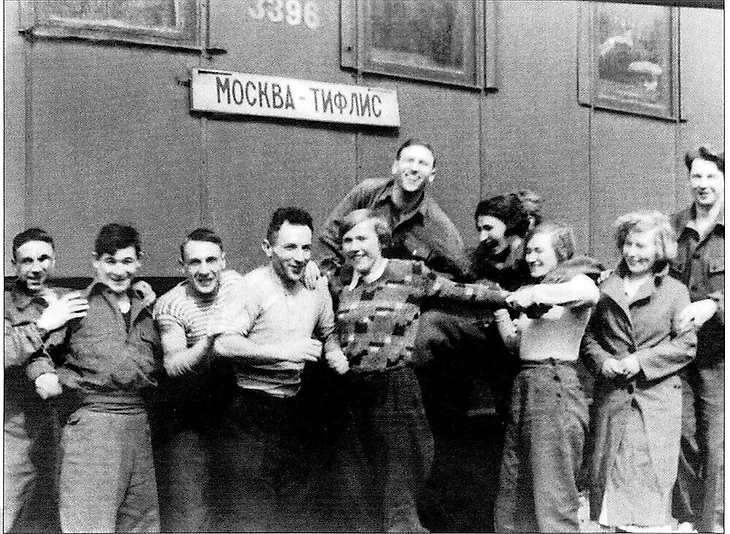 На VI чемпионат СССР в Тифлис отправляются женская (займет I место) и мужская команды Москвы. Слева направо: Александр Лобанов, Александр Зинин, Владимир Горохов, Степан Спандарян, Вера Тетерина (Серова), Евгений Бокуняев, Мэри Орахелашвили, Мария Козлова, Мария и Ярослав Титовы
