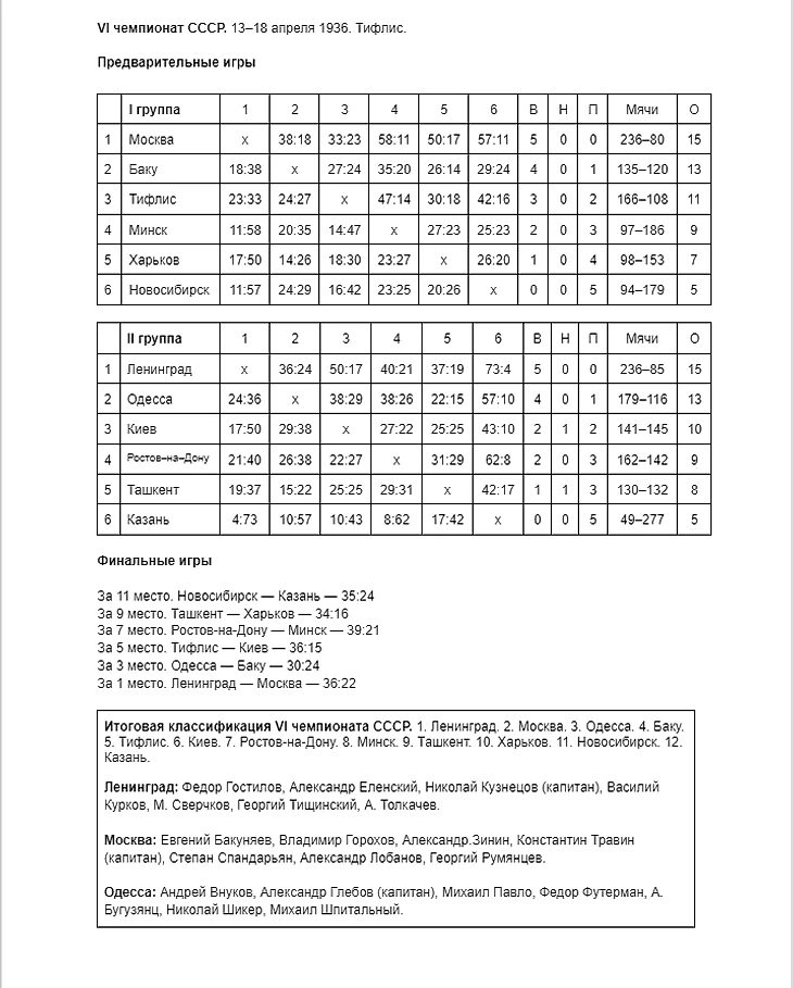 Ленинград подтверждает звание лучшей команды страны 1936 года в новом турнире (до 1952 года – втором по значимости в стране, называемым еще «зимнее первенство СССР») I МАТЧЕ ГОРОДОВ СССР. Предполагалось, что это будет противостояние шести команд, но сборные Киева и Одессы на берега Невы не приезжают. Неожиданно-ожидаемо в распределение призовых мест врывается Тифлис: южане в группе переигрывают москвичей – 30:28. Зрелищный был матч! Тифлис в дебюте был впереди – 8:0, Москва перед финалом догнала – 28:28, но на самой «ленточке» Оганезов забивает два штрафных. Да, как мы уже знаем, точное пробитие штрафных тогда решало исход в большинстве матчей равных по силам соперников.