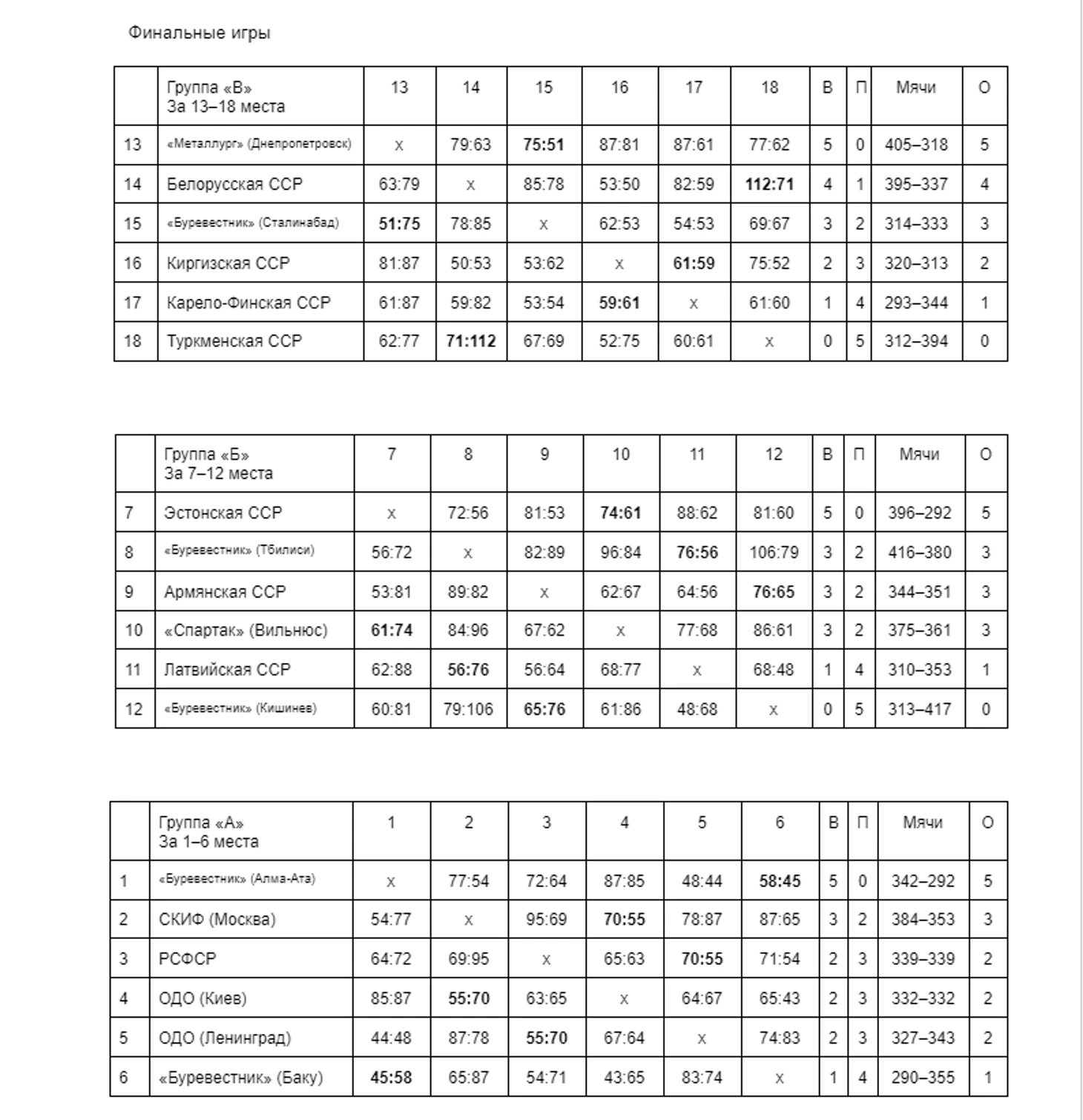«Динамо» Тб, ОСК Р — 6 побед (в 6 матчах), «Спартак» Р — 5 (7), «Динамо» М — 4 (6), «Буревестник» Л, «Спартак» М, ЦСКА МО — 3 (7), «Жальгирис» — 2 (6), «Буревестник» К, «Калев» — 0 (6).