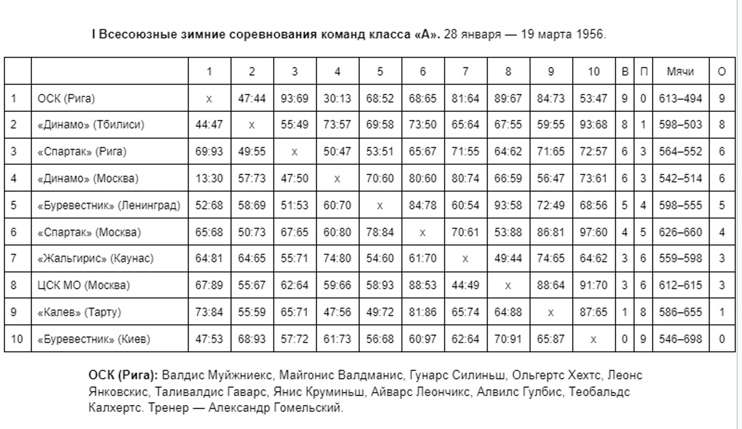 Понятно, что в олимпийский год весь календарь заточен на подготовку к играм в Австралии. И Всесоюзные зимние соревнования команд класса «А», которые выигрывают рижские армейцы Александра Гомельского. И многочисленные турниры и контрольные матчи сборной. И первая Спартакиада народов СССР — с участием и проверкой готовности лучших баскетболистов всех республик. Одновременно — чемпионат страны. Он тоже завершается победой команды Гомельского — сборной Латвии.