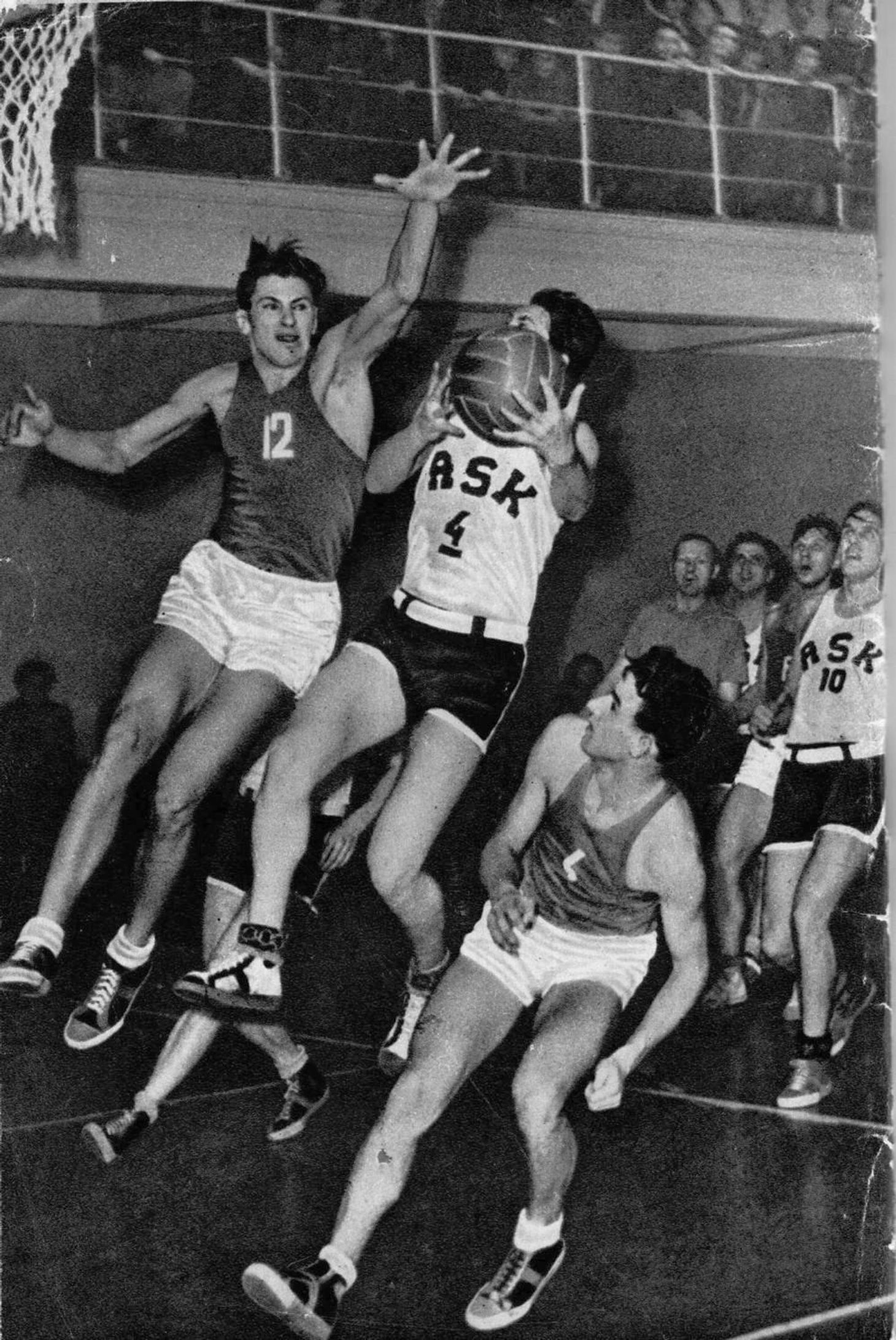 28 января 1956. Рига. Матч I Всесоюзных зимних соревнований команд класса «А» ОСК — «Калев» — 84:73. В атаке рижане Валдис Муйжниекс (№ 3) и Айварс Леончикс (с мячом)