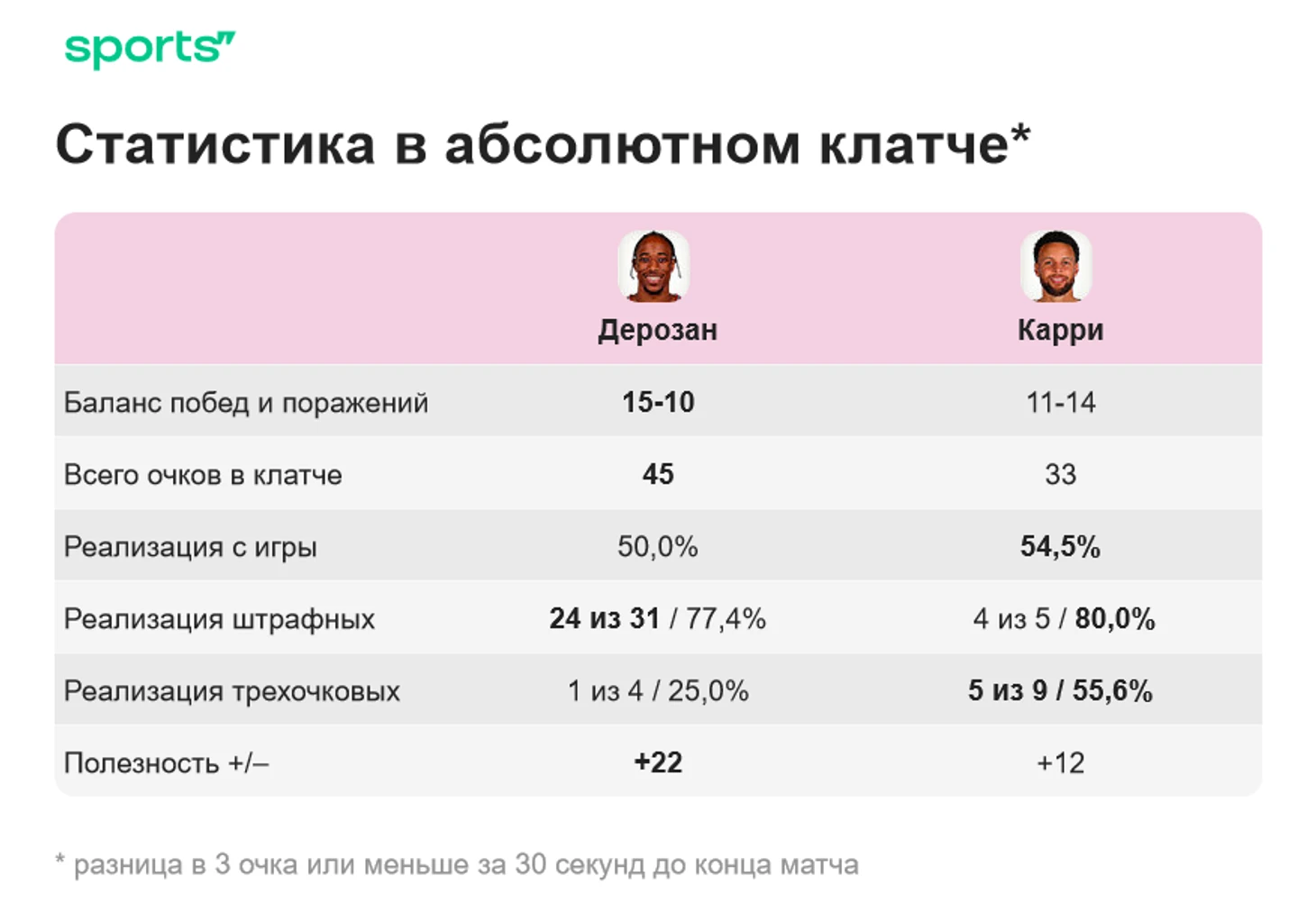 Кто-то скажет – подумаешь, доля процента. Но разве не сотые и не секунды решают, когда речь идет о клатче? Они как дюймы в той самой знаменитой мотивационной речи Аль Пачино из фильма «Каждое воскресенье». И когда на табло остаются считанные секунды и вы хотите победить, лучше бы вам иметь в составе Демара Дерозана. Вот как выглядят наиболее значимые характеристики двух претендентов в самых жестких условиях: когда судьба матча решается за последнее владение: