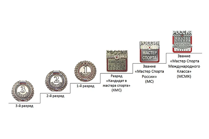 Взрослые: кандидат в мастера спорта (КМС), мастер спорта (МС), мастер спорта международного класса (МСМК).