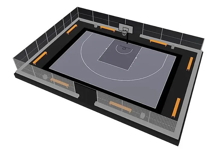 • Дополнительные элементы: стойки и щиты с кольцами, расположенными на высоте 3,05 метра от поверхности площадки. Разметка для замены игроков и освещение (при необходимости).