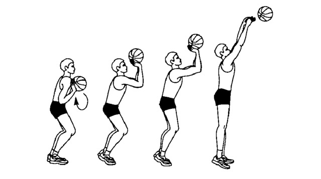 Выталкивание. Резко выпрямите руки в локтях, толкая мяч вперед. Одновременно с выпрямлением рук, кисти должны выталкивать мяч вперед, как будто вы хотите сбросить его с пальцев.