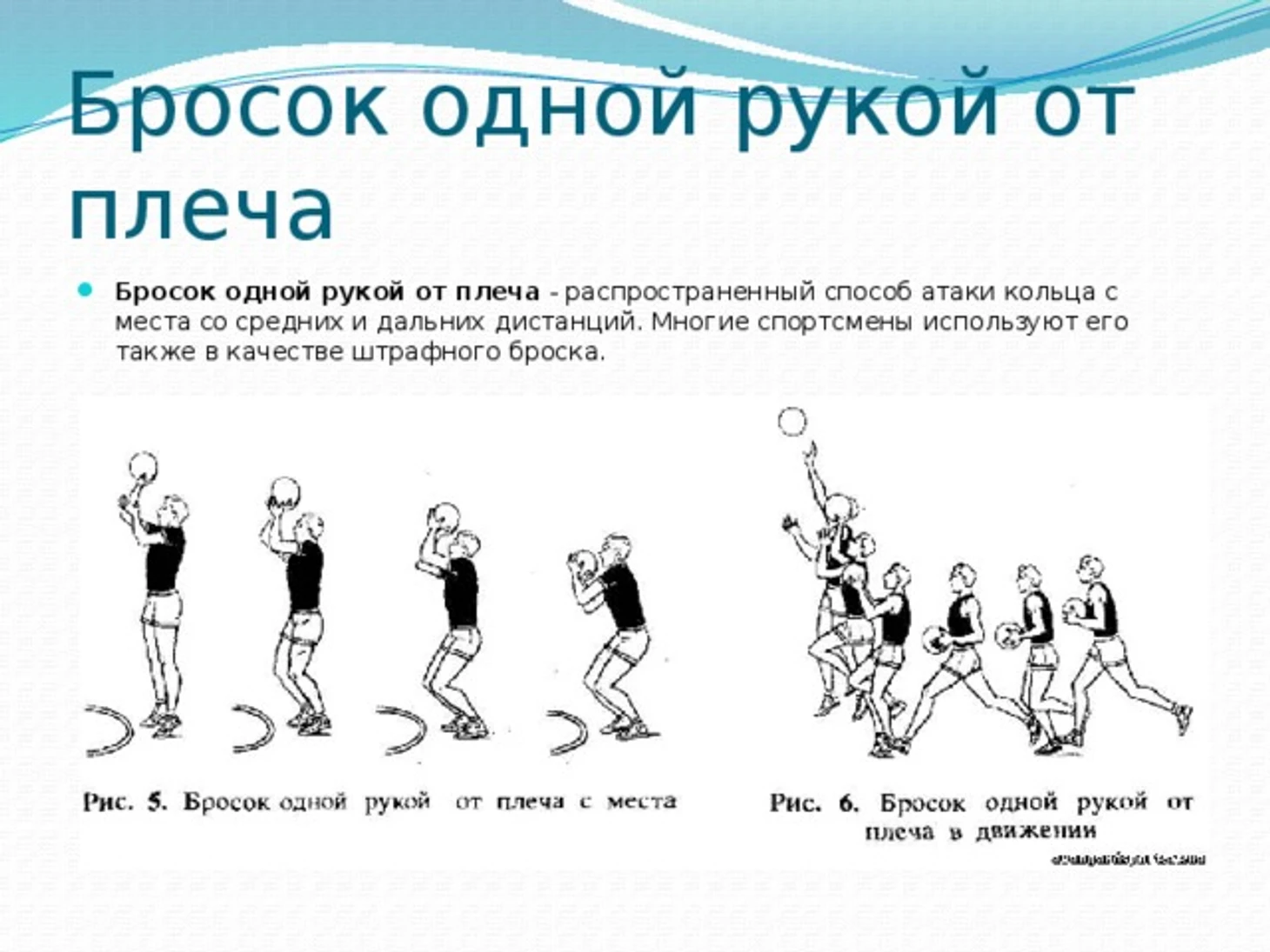 4. Отталкивание. Одновременно с выносом мяча выполняется толчок ногой, одноименной с бросающей рукой.
