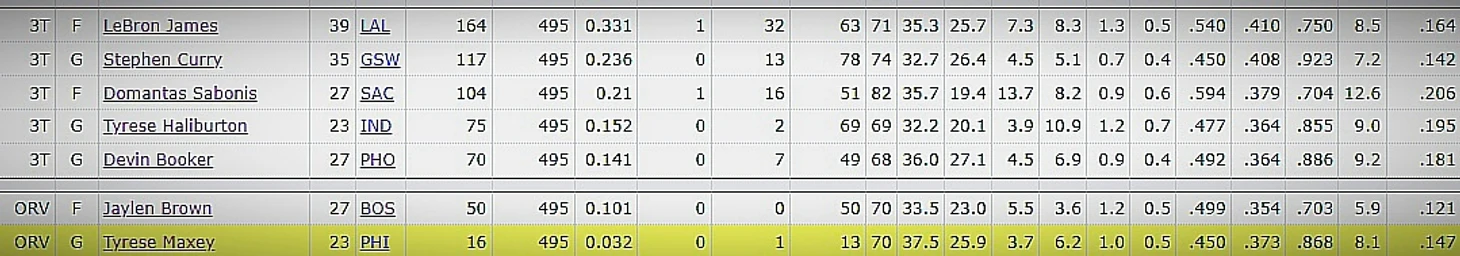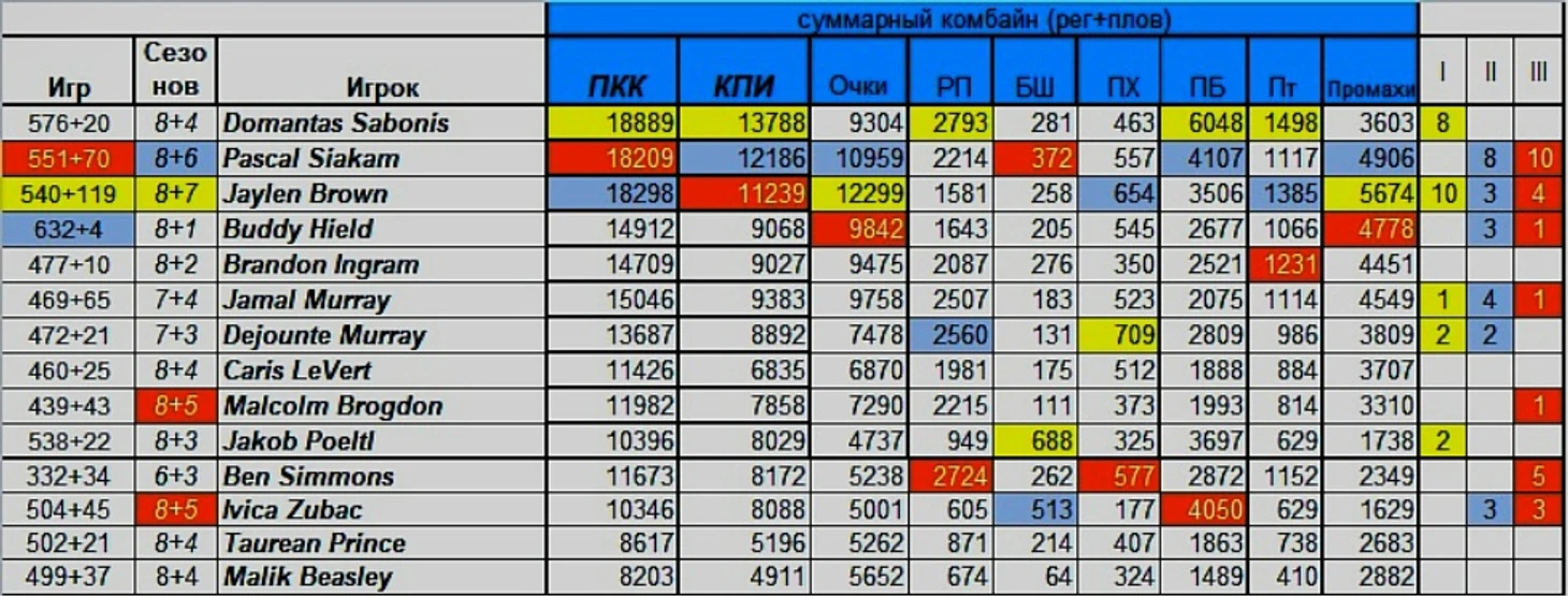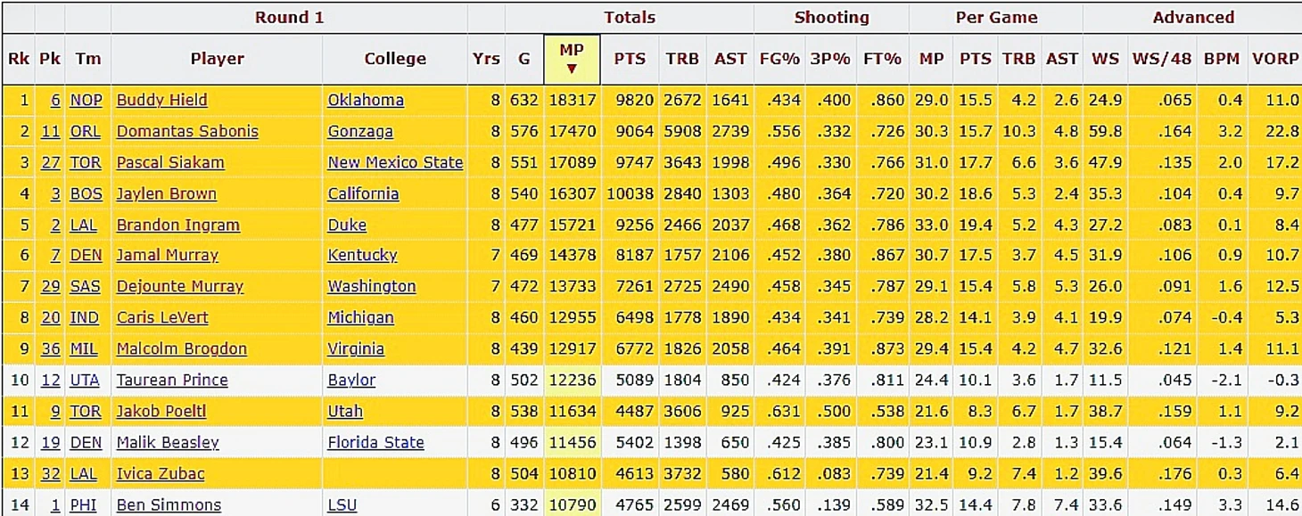 В итоге Симмонс по прошествии 8 сезонов лишь на 14-м месте по игровому времени в своем драфте. Если этих одноклассников расставить по набранным очкам, Бен поднимется на пару строчек, но все знают его трудовое досье: пропустил два сезона полностью, а последние два грабит Бруклин. Тот же Эмбиид, пропустив полностью сезон и «травмируясь в каждом следующем», даже с такой форой умудрился забраться очень высоко в своем драфт-классе на высочайшей производительности и эффективности. Чтобы заметить, что австралиец окончательно прибурел и давно проел уже все выданные ему авансы, не нужны калькуляторы. Но посмотрим на игроков, до сих пор проводящих серьезную работу