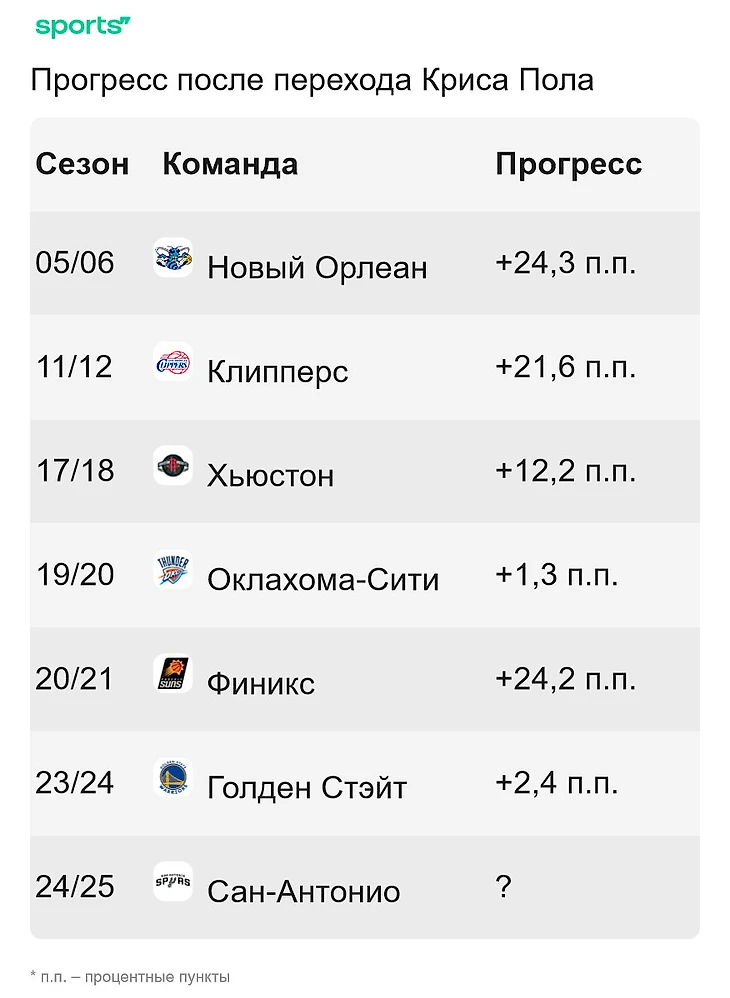 Лишение Пола приставки «топ» вместе с тем не означает, что он перестал быть эффективным игроком, которым был всегда. Вот как выглядит прирост процента побед в первый год прихода Пола в новую команду НБА: